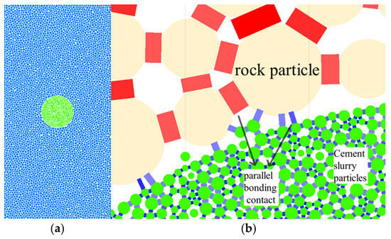The cement-filled specimen model is shown in Figure 5a, where the particle size range of the cement paste is 44 μm to 100 μm, the spatial distribution of the particles is set in a uniform and random manner, and the cement paste particles are distributed in a circular contour based on the hole-containing defect model. The cementation between the cement paste and the rock specimens is critical to the strength of the specimens. Due to the rock-like nature of the cement paste material, the cement paste and rock particles in the filling test model are still modeled with parallel bonding, as shown in Figure 5b. The bond between the grout and the rock is a parallel bond contact force, which is consistent with the overlay type in the bonding pattern at the grout–rock interface described by Li W. et al. []. The upper and lower walls of the model are used as loading tools, and the relative movement rate of the upper and lower loading plates is 0.001 mm/s, which simulates the loading rate of 0.002 mm/s used in the indoor tests.