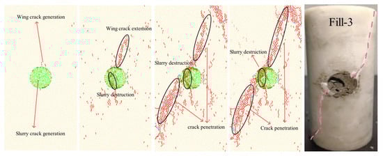 Cement-filled specimens initially exhibited sporadic microcracks at the periphery of the apertures and within the cement slurry. As the specimens approached the peak stage, microcracks continued to develop at the primary fracture surface of the rock samples and in the filled slurry. The distribution of cracks was significantly denser than in the first two rock sample types, the hole filling had a higher concentration of cracks compared with intact rock, and wing cracks began to develop in the axial direction. As the specimen progressed to 45% of peak stress, the cracks were essentially complete, and obvious rupture surfaces emerged. This was accompanied by the formation of significant macroscopic cracks, while a substantial number of microcracks manifested within the filling area.