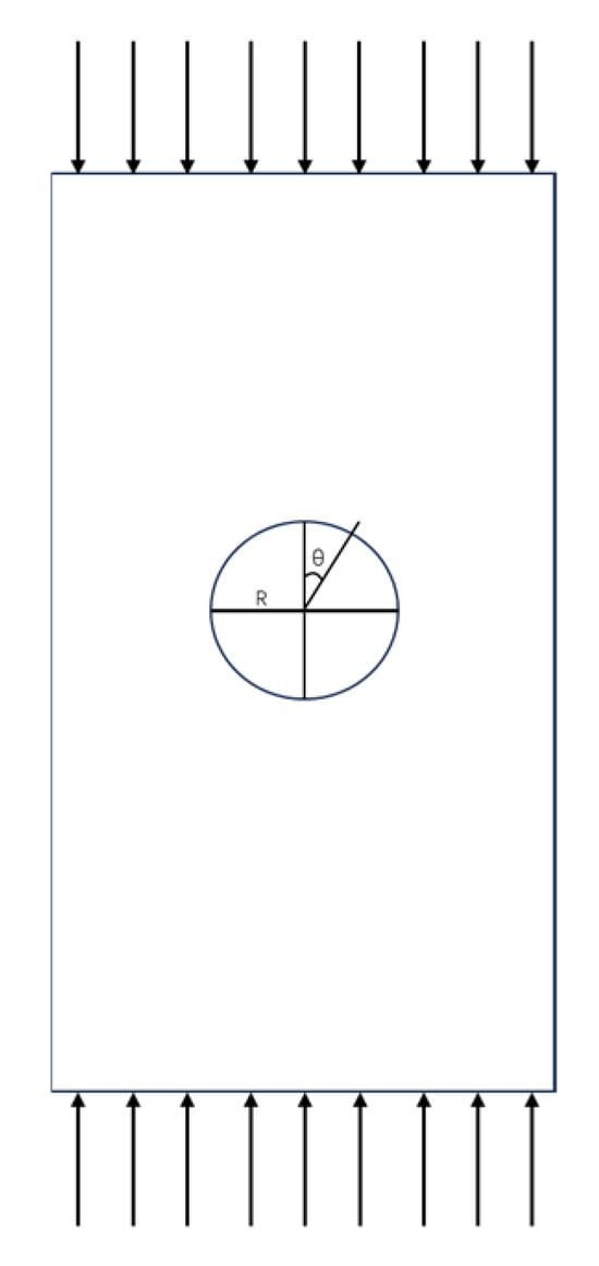 As illustrated in Figure 11, the specimen model features a circular aperture with radius R, to which unidirectional pressure q is applied, with an angle θ formed with respect to the vertical direction. In the event of the outer boundary of the model being altered to a circular boundary such that (R1 >> R), an inner boundary condition of p = R is established.