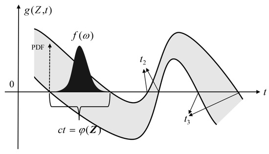 For Equation (6), the LSF can be transformed to be solved. As shown in Figure 2, the two curves and gray shaded portions contained represent all possible performance functions, i.e., clusters of performance functions. The first intersection of the cluster of performance functions with time axis constitutes the FCTP set. The set can be represented as a function of input variables, i.e., . The black shaded portion can represent the PDF of FCTP, . Equation (6) can be transformed as follows: