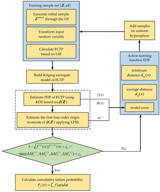 Based on probabilistic properties of the input random variable , samples are generated by simulation. The FCTP surrogate model is built using Kriging models and EDF learning function. The FCTPs are computed for all samples. The PDF of FCTP is obtained by combining the KDE method as follows: