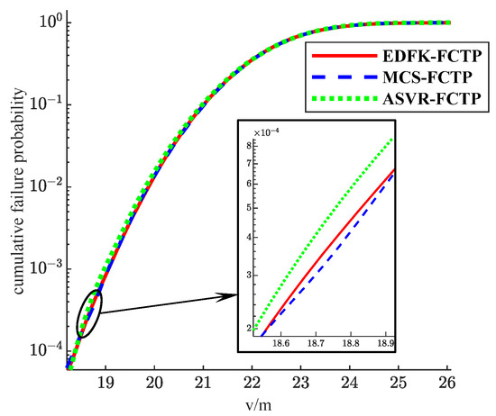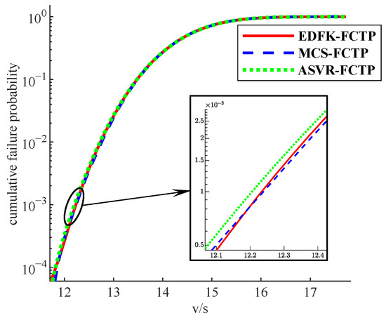 EDFK-FCTP, ASVR, and MCS-FCTP are used to calculate the trend of the failure probability of the wing structure with the x-axis. As shown in Figure 10, the estimation accuracy of EDFK-FCTP is high. Comparing the three curves in Figure 11, both EDFK-FCTP and ASVR have higher accuracy in solving failure probability. However, the fitting accuracy of EDFK-FCTP is more advantageous in low failure probability region. Further, Table 7 demonstrates the relative errors of the six-moment points, indicating that the accuracy of the proposed method can guarantee the engineering requirements. Further, as shown in Table 7, the relative errors at six moment points indicate that the accuracy of the proposed method can guarantee engineering requirements.