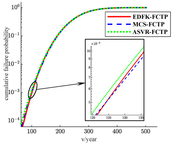 where both and follow normal distribution with and . The PDF of FCTP is calculated as shown in Figure 4. The variation in cumulative failure probability is obtained by integration over time, shown in Figure 5. In the figure, MCS-FCTP denotes the Monte Carlo-based method, ASVR-FCTP denotes adaptive method-based on support vector regression model [30], and EDFK-FCTP denotes the method proposed in this paper.
