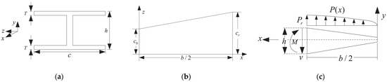 Scheme of wing structure: (a) cross-sectional view of the wing, with T, h, and c representing the thickness, depth, and chord length of the wing, respectively; (b) the top view of the wing, where b denotes the span; (c) the loads acting on the wing.