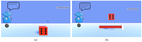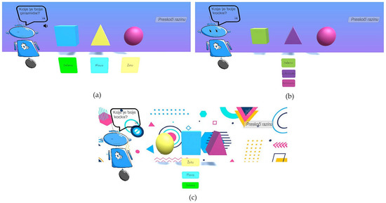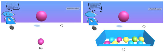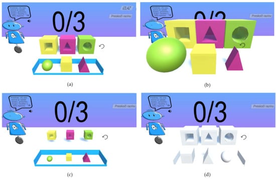 The goal of the interactions on the first level, shown in Figure 2, is to place three geometric solids (sphere, cube, and pyramid) in the correct boxes. Participants must perform a certain interaction to progress in the game, regardless of the result. In situations where they cannot perform the required interaction, the alternative option is to skip the sublevel.