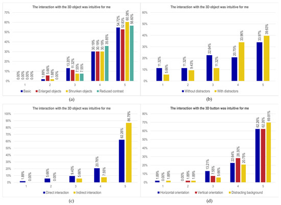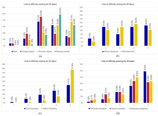 - Reduced contrast—sublevel with reduced contrast between the background color and the color of the 3D objects, while the ratio of the virtual hand size to object size is the same as in the basic sublevel (Figure 2d).