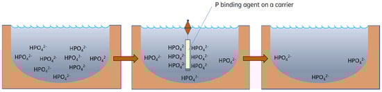Taking this into consideration, we developed a novel approach for P removal from water bodies enabling the application of a binding agent into the water column for a given time, using packaging or a carrier, to allow P sorption and the subsequent removal of the carrier together with the P-loaded binding agent (Figure 1). Such a measure ensures P inactivation and P removal from the ecosystem and eliminates risks related to the disposal of the binding agent in the aquatic environment. We thus called this approach a non-invasive phosphorus removal [39]. The P binding agent can be applied to a water body in a given site at target depth and, for a given period, without the risk of being allocated. At the same time, the removal of the agent together with the inactivated orthophosphate (OP) opens the chances for P recovery and reuse.