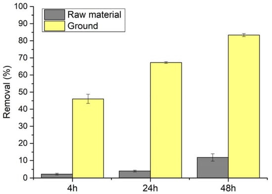 Calcite material used in this study was produced using limestone rock as a starting material. Limestone came from Jurassic deposits in Bukowa mine (Bukowa, Poland) operated by the company Lhoist Bukowa Poland. The mineral calcite constituted 95% of the material by mass [62]. The grain size of the initial material was ≤4 cm, with a particle diameter d90 of 3120 µm and specific surface area (SSA) of 7.2 m2 g−1 (determined with the BET method; see Section 2.4 for details). To increase its SSA and affinity for the OP, the limestone material was further ground in a laboratory ball mill (Pulverisette 6; Fritsch, Idar-Oberstein, Germany) for 30 min at a grinding speed of 350 rpm using 37 balls of the total mass of 500 g (corresponding to the sample mass/ball mass ratio of 10:1). Resulting material parameters were grain size of d90 = 55 µm and SSA = 15 m2 g−1. In a simple batch test, this material removed 7–20 times more OP compared to the initial limestone sample, depending on the reaction time employed (Figure 2).