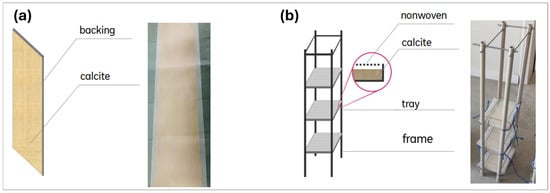 Laminates were strip-shaped sheets covered with calcite (Figure 3a). They consisted of a carrier material coated with an adhesive layer made of biodegradable glue, the main components of which were water and carbohydrates [41]. A calcite layer of about 2 mm thickness was attached to the glue. This was achieved by spreading finely grained calcite material over the laminate surface. The glue layer was capable of keeping the calcite particles fixed in the laminate structure, still enabling the contact between the active surface and surrounding water. However, compared to the freely added calcite material (as powder), the laminates fixed 9–33% less OP depending on the properties of the calcite used (different grain size and surface area) and experimental conditions [41]. This was probably because the calcite particles were partially covered with a glue layer, which limited the active mineral surface contributing to the OP sorption [39,41].