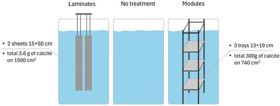 For a comparative test of the two carrier types, laminates and modules, an incubation experiment in mesocosms was performed (Figure 4). Lake water was sampled from the eutrophic Lake Skarlińskie (NE Poland) in April and transported to the laboratory. The lake water was further poured into plastic chambers (diameter of 57 cm, height of 81 cm) (Figure 4). Each chamber was filled with 180 L of the lake water and left without any intervention for about 6 days to stabilize. After 6 days, modules and laminates were immersed or suspended in chambers and further incubated for 42 days. Two laminate strips were used, with a total surface area of 1500 cm2 (15 × 50 cm each) and a total mass of calcite of about 3.6 g (Figure 4). Modules consisted of three trays with the total surface area of 740 cm2 (13 × 19 cm each), filled with calcite with the total mass of 300 g and covered with mesh to prevent material loss. Chambers without any additions served as control. The whole volume of water in each chamber was mixed twice a day. Incubation took place without light access. During the experiment, the temperature in the laboratory hall was 8.0–13.5 °C. The experiment was conducted in duplicates.