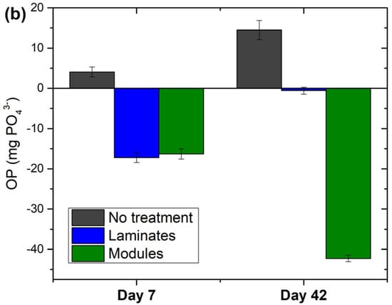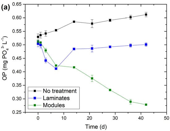 The concentrations of the OP in the lake water showed different dynamics depending on the treatment applied. In the control mesocosm the OP concentration showed a rising tendency throughout the experiment duration and increased from 0.52 to 0.61 mg PO43− L−1 (Figure 5a). Consequently, the OP mass balance for this mesocosm was positive (Figure 5b). This indicates release processes due to the decomposition of the organic material without the reuse of the free phosphate (limited light access). Compared to control, in the chambers with laminates and modules, a different pattern in the OP dynamics was clearly visible. The OP concentration decreased starting from the very initial stage of the experiment. This effect was seen already after 3 days—the OP concentration continued to decrease while an opposite change took place in the control mesocosm (Figure 5a). Initially, both, laminates and modules, showed similar levels of OP elimination, lowering the OP availability by about 17–18% within 7 days compared to the initial level and 24–26% compared to the control chamber (Figure 5a). At this point, the OP mass balance was thus clearly negative in both treatments (Figure 5b). At longer exposure, the laminates were not able to force a further decline, and the OP concentration started to rise, almost reaching the initial OP level (Figure 5a). However, the OP concentration remained at least 15% lower compared to the control mesocosm for the next 35 days (Figure 5a).