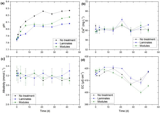 Alkalinity fluctuated in a small range of 3.1–3.3 mmol L−1 (at the measurement accuracy of 0.2 mmol L−1 (Figure 6c)). Although no trend could be seen, in the control mesocosm, the alkalinity was lower during the incubation, compared to the initial conditions; the same pattern could be noticed in the treatment using modules. Meanwhile, in the mesocosms with laminates, the alkalinity increased at some points in time compared to the initial level, especially at the end of the experiment (Figure 6c). Electrolytic conductivity changed in a small range between 400 and 420 µS cm−1. The dynamics in time were generally the same in all chambers, with a slight increase at the beginning of the experiment and further decline after 2 weeks (Figure 6d).