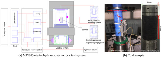 Experiments were conducted at 25 °C using an MTS815 electrohydraulic system (MTS Systems Corporation, Eden Prairie, MN, USA) capable of applying axial loads and stabilizing confining pressures [15]. The apparatus integrates five subsystems: digital control, hydraulic actuation, axial loading, pore pressure regulation, and confining pressure stabilization. Pre-damaged coal specimens were prepared using the circumferential displacement-controlled mode of the MTS815 mechanical testing system to maintain structural stability during the yielding phase and prevent sudden fragmentation. The circumferential displacement loading rate was configured at 0.002 mm·s−1, with each loading cycle achieving a 1 mm displacement increment. Unloading phases employed force-controlled mode, progressively increasing axial load removal rates to accomplish stress relaxation. The circumferential displacement sensor and coal specimen are shown in Figure 1b.