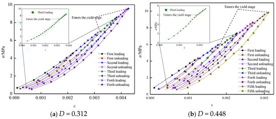 Based on the damaged coal specimen preparation methodology and the damage variable calculation formula (Equation (1)), the stress–strain curves of coal specimens with varying initial damage severity levels under cyclic loading–unloading conditions are illustrated in Figure 2 [39].