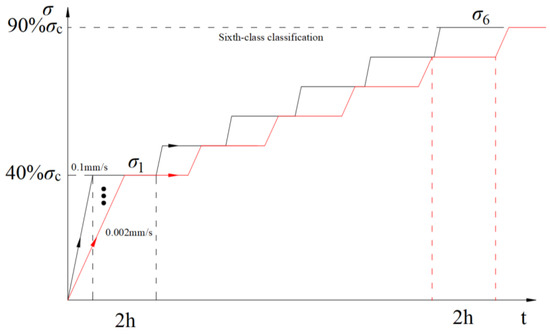 The creep load was determined as 90% of the triaxial compressive strength (TCS) of initially damaged coal specimens, subsequently partitioned into six equal increments from 40% to 90% of the triaxial compressive strength (TCS). A stepped loading protocol with 2 h dwell time per stress level was implemented under 2 MPa confining pressure, with the triaxial multistage creep loading path detailed in Figure 3.