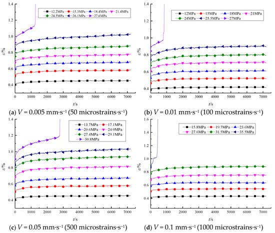 Figure 4 reveals that under different displacement rates, at lower applied stresses, the creep deformation stabilizes after undergoing a decelerated creep stage. As the stress level increases, the creep transitions into a steady-state creep stage. Upon reaching the final load stage, the creep enters an accelerated creep stage. When the loading rate reached V = 0.1 mm·s−1 (1000 microstrains·s−1), the accelerated creep failure stage exhibited instantaneous and abrupt characteristics, with a dramatic increase in deformation rate culminating in catastrophic instability (Figure 4d).