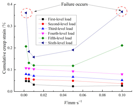 Diagram of the cumulative creep strain relationship under the same level of load with different loading rates.