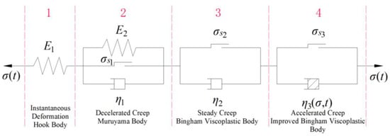 This study establishes a nonlinear integer-order viscoelastic-plastic creep model, which is composed of four elements connected in series: a Hook body, a Muruyama body, a Bingham body, and a modified Bingham body (Figure 6).