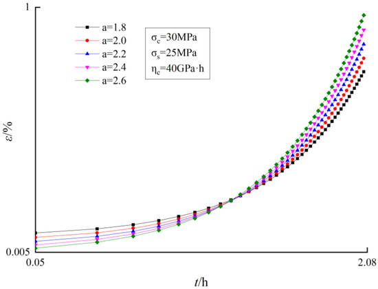 By substituting the relevant parameters into Equation (4), the influence of parameter a on creep acceleration is obtained as shown in the figure. It can be observed that an increase in parameter a leads to a higher creep rate in the curves. This demonstrates that the accelerated creep stage can be quantitatively characterized by controlling the magnitude of parameter a, as can be observed in Figure 7.