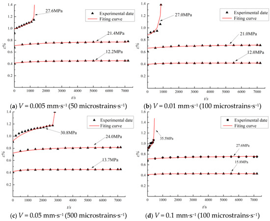 Parameter identification for the established creep model was conducted using 1stOpt 5.0 software, in which the global optimization Levenberg–Marquardt (LM) [51] algorithm was employed to perform nonlinear fitting on the creep data of coal samples. The fitting curves of coal sample creep data under different loading rates are shown in Figure 8.