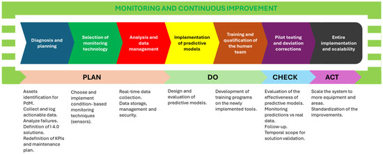 The EN 16646 standard [12] emphasizes that effective maintenance policies must integrate diverse perspectives by understanding the interdependencies between operations and value creation across the asset lifecycle. The transition from preventive to predictive and sustainable maintenance can be framed within the continuous improvement paradigm. Continuous improvement traces its origins to the mid-20th century with W. Edwards Deming’s development of the PDCA (Plan–Do–Check–Act) cycle [13], a four-stage iterative problem-solving framework. This methodology can be systematically applied through the following stages: diagnosis (problem description and analysis), root cause analysis, definition of countermeasures and target values, implementation, monitoring, and standardization [14]. Therefore, the “Plan” phase comprises: (1) redefinition of key performance indicators (KPIs) and target asset selection, (2) sensor selection and deployment, and (3) data collection, analysis, and storage. The “Do” phase involves: (4) predictive model development, and (5) staff training and competency development. The “Check” phase includes: (6) solution validation and performance monitoring within a defined temporal scope. Finally, the “Act” phase involves: (7) scaling the implementation to additional assets, the standardization of procedures, and monitoring to prevent performance degradation over time (as illustrated in Figure 1). Once the “Act” phase is completed, a decision is made either to replicate the solution in new facilities and/or assets or—if the results have not met expectations—to restart the cycle to achieve the objectives initially planned. For comprehensive guidance on implementation tools, methodologies, and critical success factors, refer to [15,16,17,18,19].