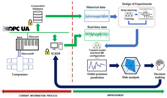 The objective is to implement Industry 4.0 technologies with the aim of enhancing maintenance up to level 4 and reducing the over maintenance through the utilization of real-time data monitoring based on predictive techniques. The acquisition of knowledge involves the training of a neural network that employs self-attention mechanisms to identify the hyperparameter configuration that most effectively aligns with the type of data generated by sensors. Due to the enormous volume of real-time sensor data generated in facility operations, a highly specialized distribution control system is implemented in order to enable efficient analysis and decision-making. Figure 2 illustrates how data are collected through the asset’s sensors and connected via Ethernet to the control racks, which then send the signal to the unique database, which then shares the data through the OPC-UA server for subsequent processing by users. No data can be managed or stored either on the cloud or external servers due to the organization’s current security policy, thus the raw sensor data are transmitted directly to clients, who process the monitoring in real-time through a SCADA system and adjust variable values as required to prevent out-of-range operating situations.