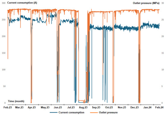 The data presented in Figure 3 reflect fifteen-minute averages of both the outlet hydrogen pressure and the main motor’s current consumption. As illustrated, five scheduled equipment shutdowns—associated with preventive maintenance—are evident, with the most prolonged interruption occurring during the summer months.