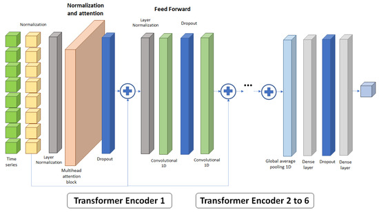 This set of layers and blocks forms the normalization and multi-head attention block. Multiple attention blocks can be used to detect further associations and relationships among data points and/or groups of data across different levels. These vectors are then combined using an additional neural network into a single compressed vector. Furthermore, a dropout layer is applied to its output [65] in order to prevent the excessive overfitting of the model.