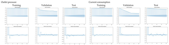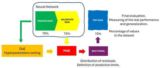 Figure 5 illustrates the process followed. The data have been divided into three subsets: training (70%), validation (15%), and testing (15%). The hyperparameters are adjusted according to the determinations made in the DoE, and the MAE values for the validation data are calculated. Once the model with the optimum MAE is identified, the residuals are determined to establish the prediction limits. The testing data are used to assess whether the network possesses the desired predictive capability.