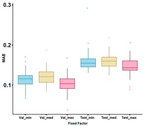 Box plot of MAE for validation and test data. Points marked with (*) are outliers.