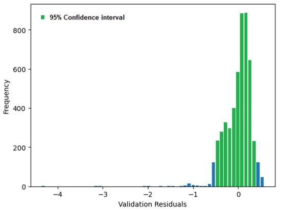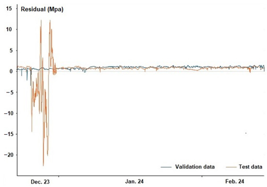 Figure 7 illustrates the residuals of the validation and test data, which represent the difference between the observed actual values and those estimated by the neural network. It is readily apparent that the residuals exhibit bias, specifically 0.91 MPa, indicating that the predicted values are systematically lower than the actual values. Furthermore, the distributions of these residuals are non-normal.