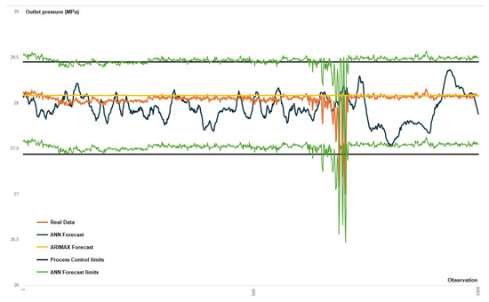 The equipment produces data points every minute, with the output pressure nominally set at 27.95 MPa and controlled within limits of 25.99 and 29.91 MPa. With the objective of stabilizing the process and improving the predicting capacities of the neural network, it is necessary for operation to occur on a fifteen-minute basis and it is imperative to adjust the control limits to align with the new average values. This makes it easier to predict the next few hours of operation, as opposed to predicting the equipment’s behavior over the next few minutes. By applying the central limit theorem, the new limits for the average out pressure have been established at 27.44 and 28.45 MPa utilizing the expression σ = (29.91 − 25.99)/(6√15) to estimate the new standard deviation. Thus, the new limits control will be set at ±3 σ.