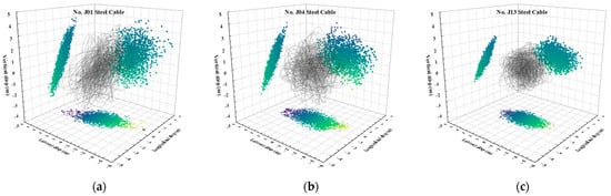 As shown in Figure 15, the three-dimensional motion trajectories of the stay cable midpoints were plotted using the lateral response (x-axis), longitudinal response (y-axis), and vertical response (z-axis). By observing their projections on the x-y, y-z, and x-z planes, the following can be noted: For steel cables J01, J03, and J13, the lateral motion trajectories exhibited a more scattered distribution than the vertical component, with isolated points at the edges of the projected point clouds. This indicates the occurrence of abnormal lateral oscillations in the steel cables. In contrast, the CFRP cable midpoint trajectories displayed more concentrated circular distribution patterns across all three projection planes, reflecting smaller vibration amplitudes. These observations will be further discussed through spectral analysis.