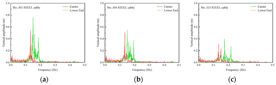 Vertical response spectra of the stay cables for the two schemes: (a) No. J01 steel cable; (b) No. J04 steel cable; (c) No. J13 steel cable; (d) No. J01 CFRP cable; (e) No. J04 CFRP cable; (f) No. J13 CFRP cable.
