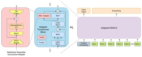 Inspired by Xception [], we design a depthwise separable convolutional adapter. As shown on the left side of Figure 2, our adapter first reduces the dimensionality through a fully connected layer to decrease computational load and enhance generalization ability. Subsequently, it employs a separable convolution to achieve efficient feature extraction with a minimal number of parameters. Additionally, a skip connection is utilized to prevent performance degradation. Finally, a fully connected layer is applied to up-project the features back to the original dimension. As shown in Figure 2, we follow the idea of parallel adaptation and attach the depthwise separable convolutional adapter in parallel to the MLP of each adapted transformer block. With the pre-trained weights loaded into the DiNOv2 backbone, we keep all these weights frozen and only update the trainable depthwise separable convolutional adapter. The forward operations within each adapted transformer module are formally defined below, with being a pre-defined weighting factor:
