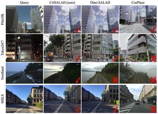 We trained our proposed CriSALAD model on the GSV-Cities dataset [], which is a large-scale VPR dataset containing images taken with Google Street View Time Machine. With the images collected from 40 major cities across the world, the dataset covers about 67,000 places spanning 2000 km2 geographically and 14 years in time. In addition, it provides a wide variety of viewpoints, illumination changes, weather conditions, etc. For evaluation, we followed the recent literature [,,] and adopted several widely used benchmark datasets for visual place recognition, including Pitts30k [], Tokyo24/7 [], Nordland [], and Mapillary Street-Level Sequences (MSLS) [].