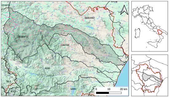 The Basento River, located in southern Italy, is one of the main rivers of Basilicata (Figure 1). It originates in the Lucanian Apennine at an elevation of approximately 1200 m above sea level and flows for about 149 km before emptying into the Ionian Sea. The river drains a basin of approximately 1535 km2, covering diverse geomorphological zones, including mountainous, hilly, and coastal areas []. The river’s upper course is characterized by steep slopes and highly erodible lithologies, contributing to frequent landslides. In the middle and lower sections, the Basento crosses wide alluvial plains where sediment transport and deposition processes dominate. The river is prone to seasonal flooding, particularly during intense rainfall events in autumn and winter. The Basento River basin in southern Italy represents a highly vulnerable area to extreme hydrogeological events, particularly floods and landslides. The combination of geological, climatic, and anthropogenic factors makes this region prone to significant natural hazards, which have historically caused severe impacts on infrastructure, human settlements, and the environment [].