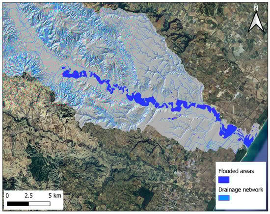 As documented by De Musso et al. [], high-resolution remote sensing data were crucial in mapping the spatial evolution of the flood event, demonstrating how extreme precipitation combined with the region’s geomorphology have led to widespread flooding. To develop a comprehensive geodatabase of historical flood events along the Basento River, information on historically flooded areas was collected and harmonized from various institutional datasets, including those from the Basilicata Region, the Southern Apennines District Basin Authority, and the University of Basilicata. The acquisitions of the flood extent derive from data available on the Copernicus Emergency (CMS) platform and COSMO-SkyMed (CSK) images supplied by the Italian Space Agency (ASI) upon request from the DPC. The latter were obtained in Stripmap mode with a 2.5 m resolution and characterized by horizontal or vertical polarization. Additional details regarding the investigated events and satellite imagery are documented in recent scientific publications [,,]. Specifically, the datasets used to support this study’s objectives include the following: