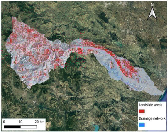 Historical records and remote sensing analyses have documented significant flood events, including those of March 2011, October 2013, and December 2013. These events caused widespread damage to infrastructure, agricultural land, and local communities, necessitating extensive emergency response efforts. The study area is characterized by low-lying floodplains, insufficient drainage capacity, and increasing land-use pressure, exacerbating flood risks. Similarly, landslides pose a persistent threat to the region, with over 1000 recorded events between 1925 and 2015, as analyzed by Dal Sasso et al. []. The high density of landslide occurrences, particularly in the hilly and mountainous areas of the basin, is attributed to the presence of unstable clayey and marly formations, as well as prolonged intense rainfall.
