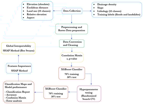 This study aimed to identify the conditioning factors that may influence the occurrence of landslide and flooding events. To achieve this, the XGBoost machine learning model was applied and the SHAP method (SHapley Additive exPlanation) was employed to assess and validate the model. The methodological workflow is illustrated in Figure 4 and is systematically outlined in the following five steps.