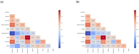 Correlation matrix: (a) flooded areas; (b) landslide areas.