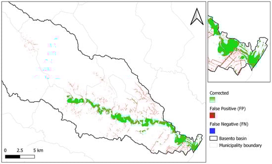As shown in Figure 6, which was related to flood-prone areas, the model correctly classified many areas of the basin. Only a small number of areas were classified as either false-positive (0.06%) or false-negative (1.24%) flood-prone areas. This observation further reinforced the earlier discussion, confirming that the model exhibited excellent performance in accurately classifying flood-prone areas. Figure 7 shows the results obtained for landslide areas and, similarly, the model correctly classified the landslide areas. Only a few cases were false-positive (2.07%) and false-negative (6.48%) landslide areas, both in the upstream and downstream zones of the basin, following the recall and accuracy results obtained.