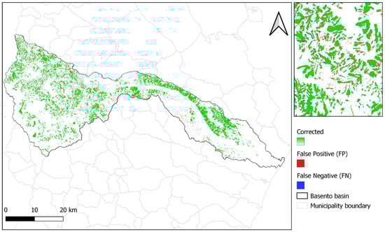 It is important to note that both models used the same conditioning factors, which may require differentiation depending on whether flooding or landslide phenomena are being analyzed. The lack of distinction between these factors could contribute to the observed decrease in XGBoost’s performance for landslide prediction compared to its performance in identifying flood-prone areas. Additionally, the analysis of the model’s performance was concluded with the error maps illustrated in Figure 6 and Figure 7.