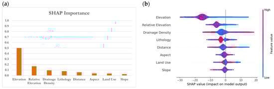 SHAP analysis for landslide-prone areas: (a) feature importance based on SHAP values; (b) Bee Swarm plot showing the distribution and impact of each conditioning factor.