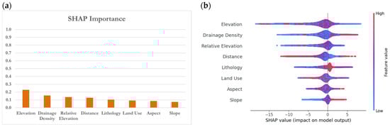 Regarding landslide susceptibility, Figure 9 shows the SHAP-based analysis for landslide-prone areas. In Figure 9a, the contributions of the conditioning factors appeared more balanced: elevation (23%) and drainage density (16%) were among the most influential, yet no single factor dominated the model. This suggested a more complex interplay of variables in triggering landslide events compared to floods. Following the same cumulative contribution logic, the most relevant variables identified included elevation, drainage density, relative elevation, distance, and lithology. The Bee Swarm plot in Figure 9b reinforced these insights by showing that landslide occurrence was generally associated with low elevation, relative elevation, and lithology values, whereas higher drainage density and distance values tended to increase susceptibility. Moreover, the SHAP score distributions were relatively uniform across the top predictors, confirming that no single conditioning factor dominated in the case of landslides, thus highlighting the need for a multifactorial approach when modeling complex geo-morphological hazards such as landslides.