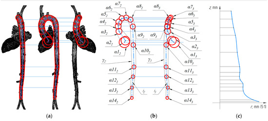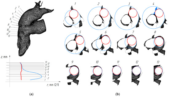 In order to study the evolution of the blood jet traveling from the left ventricle to the aorta, the construction of fourteen spheres consecutively inscribed in the system of the left ventricle and the aorta was carried out (Figure 3). Figure 3b also shows the circumferential formations of the desired surface as an approximate surface γ. Also in Figure 3b, the i-axis of the left ventricle-aorta system is shown in two connected projections, which are sufficient to construct its three-dimensional model.