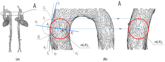When studying the shape of the left ventricular and aortic system with the aortic valve open, we measured spheres inscribed successively in the lumen of the channel, because the distortions of the spatial axis of the system in the area of the ventricle and the aortic valve do not allow us to determine the position of the normal plane of the vessel cross-section. The essence of the approach used is to inscribe in 3D object projections the connected projections of a number of spheres. In other words, the study was carried out using methods of descriptive geometry. The scheme shown in Figure 2b shows the construction of projections of the sphere α(A) touching the surface at point A on two connected projections of the aorta.