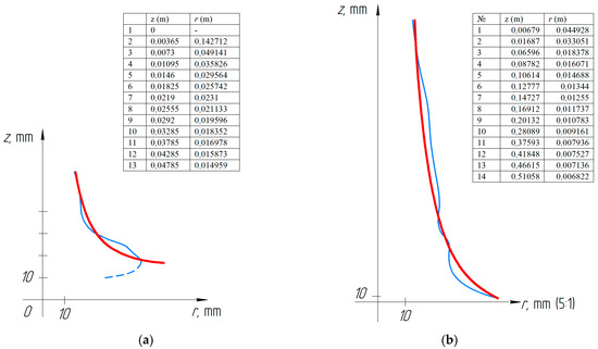 Correspondence between the graphs of the approximation curves (red) and the curves constructed on the basis of their measurements (blue): (a) change in the radius of curvature of the streamlined surface of the left atrium along the axis of the swirling jet; (b) change in the radius of the aortic left ventricular system along the axis of the flow channel.