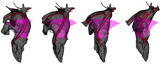 The evolution of the blood jet moving from the left atrium to the left ventricle was studied by analyzing the cross sections of these cavities (Figure 1a). The cross sections were obtained from a bundle of planes perpendicular to the contour of the selected section of the streamlined surface. The angle of view was chosen so that the plane containing the conditional axis of the atrium was parallel to the projection plane.