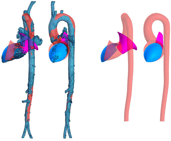 The resulting surface fragment models approximating the aorta, left ventricle, and left atrium are superimposed on the original STL model in Figure 6. In the figure, the left atrial cavity (pink) is delineated as a segment of a hyperboloid, the flow portion of the left ventricular and aortic cavities is obtained by sphere inscription (beige), and the blue surface corresponds to the concave streamlined surface lying at the jet initiation site. This surface is empirically approximated by a segment of a closed torus. The torus used is the simplest surface that satisfies the condition of concavity of the streamlined surface at the point of initiation of the swirling jet and at the same time provides sufficient accuracy of approximation.